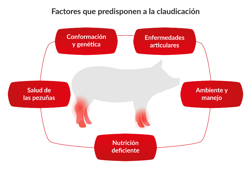 Asimismo, la nutrición deficiente es un factor predisponte para la claudicación. Las cantidades inadecuadas o incorrectamente equilibradas de calcio y fósforo, en las dietas de gestación y lactancia pueden conducir a osteoporosis, la cual se desarrolla cuando el hueso pierde minerales y masa, haciéndolo más susceptible a las fracturas y lesiones. Durante la gestación y lactancia las cerdas necesitan altos niveles de calcio, mientras que después del destete tienen poco tiempo para reestablecer sus niveles adecuadamente entre los ciclos reproductivos. Además de los minerales, otros nutrientes esenciales para el aparato locomotor son la vitamina D, biotina, aminoácidos azufrados, entre otros.