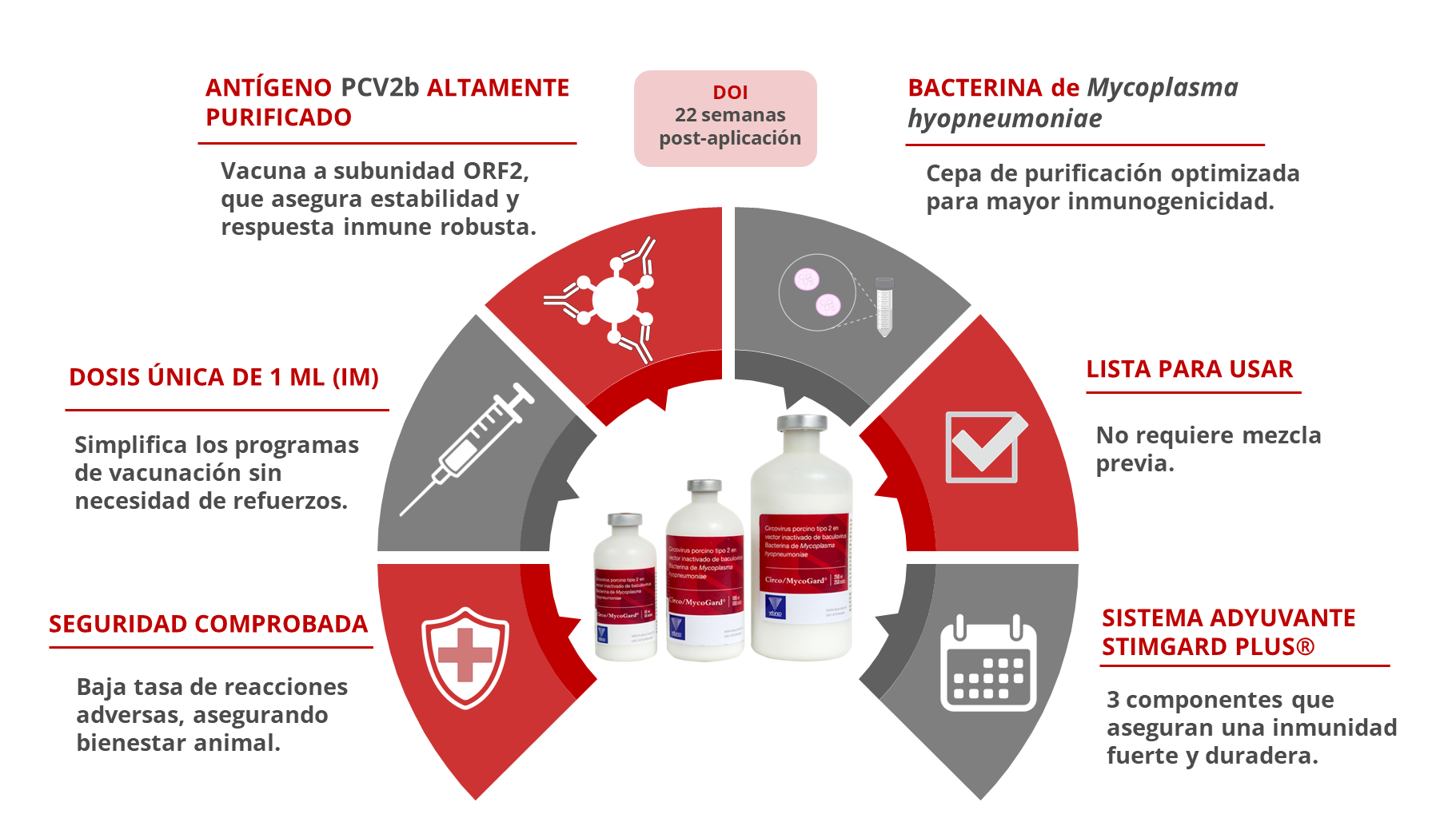 En la producción porcina, las enfermedades respiratorias y sistémicas representan un desafío constante. Circo-MycoGard® es una vacuna innovadora que protege a los cerdos a lo largo de todo su ciclo productivo, desde la aplicación hasta la faena, asegurando una inmunidad de rebaño eficaz y duradera.